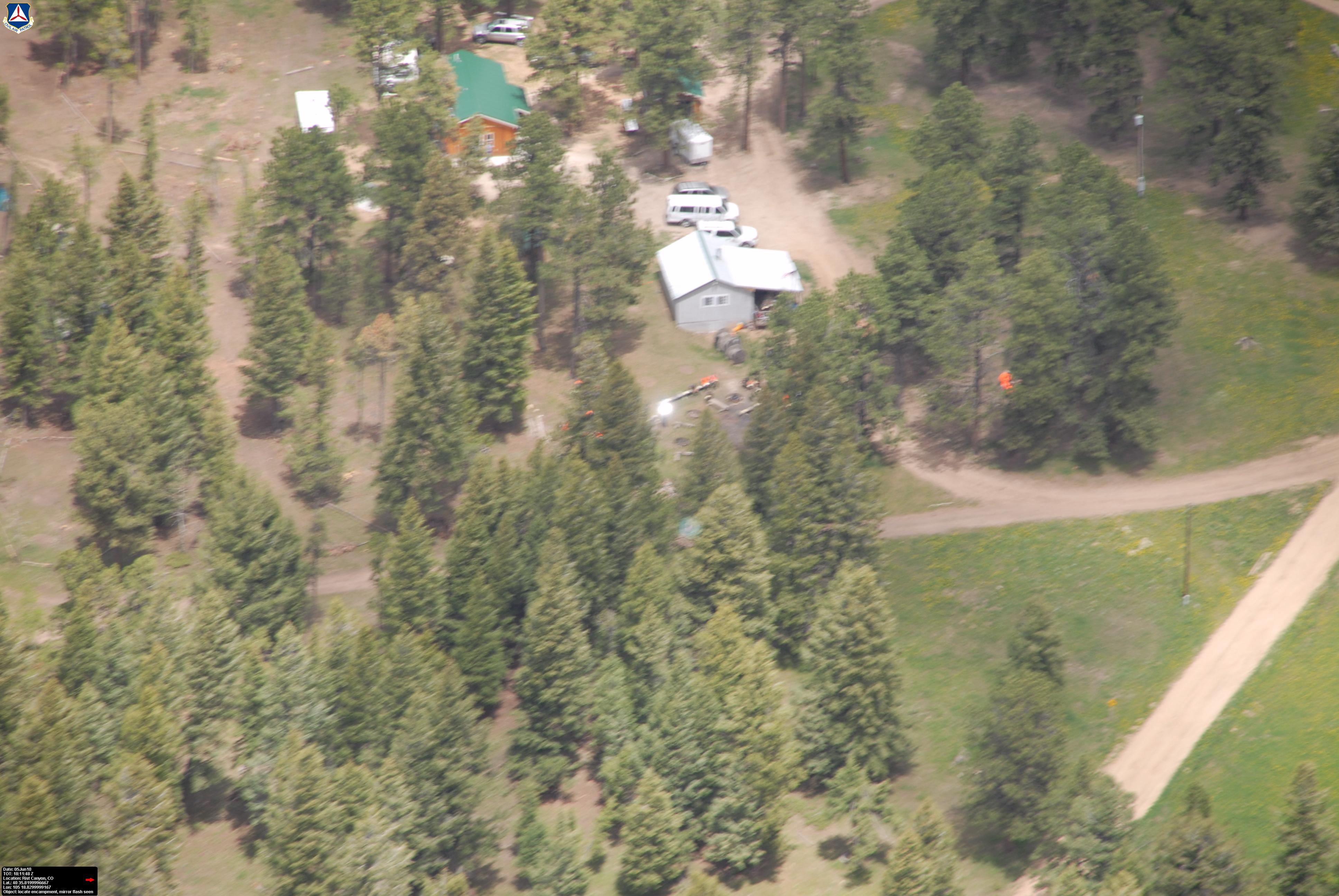 "SOS" next to picnic tables partially visible through trees. Nice mirror flash. (50/53)