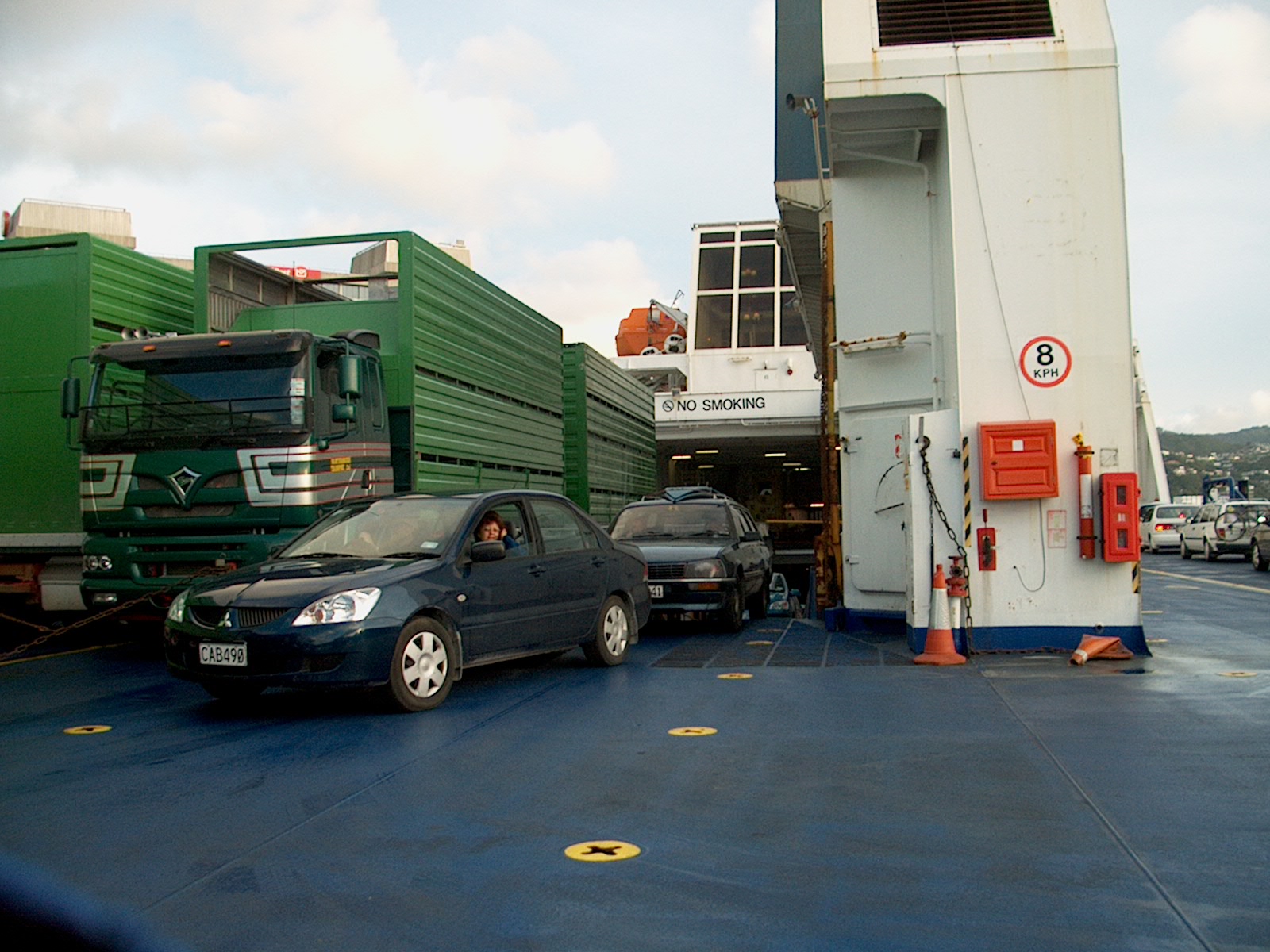 There's overflow of trucks here too on deck. We U-turn and go back into the hold. (8/113)