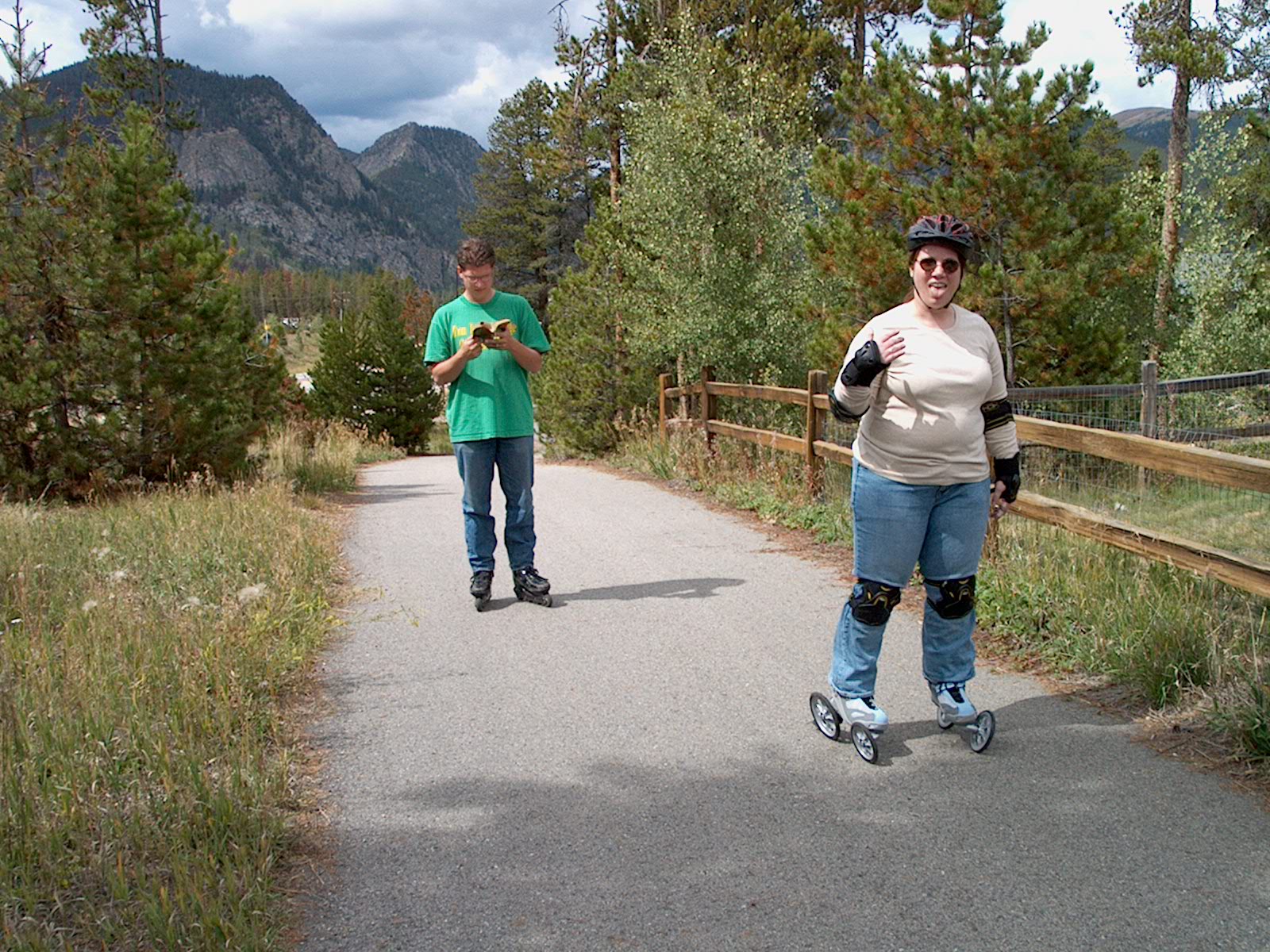 Ann pauses at the top of the hill, Chris keeps reading. Notice Ann's skates... (22/61)