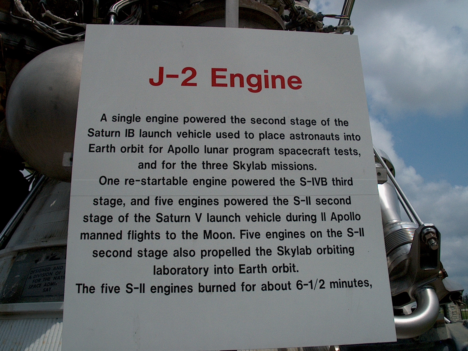 Information on the Saturn 1B's J-2 engine. I am sure there was supposed to be a second sign somewhere since it just trailed off like that. But that was the only sign there. (17/19)