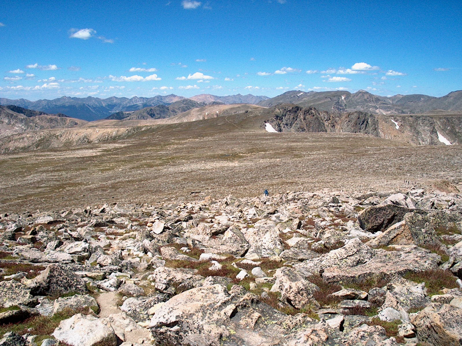 Stopped halfway up Hallet for some photos, looking northwest. Blue dot is Bob coming up. (21/40)