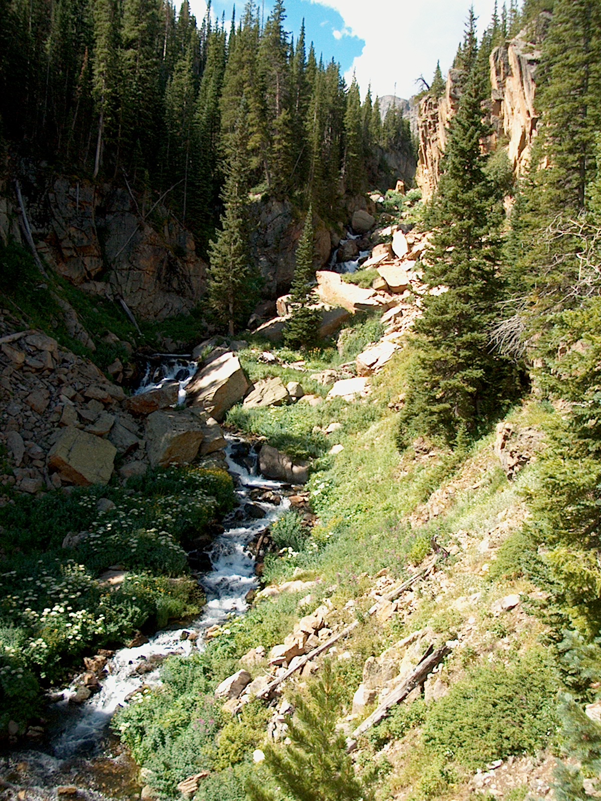Riverbed coming out of Loch Vale. Hiking trail does NOT follow the riverbed. Compare with next photo from winter! (6/80)