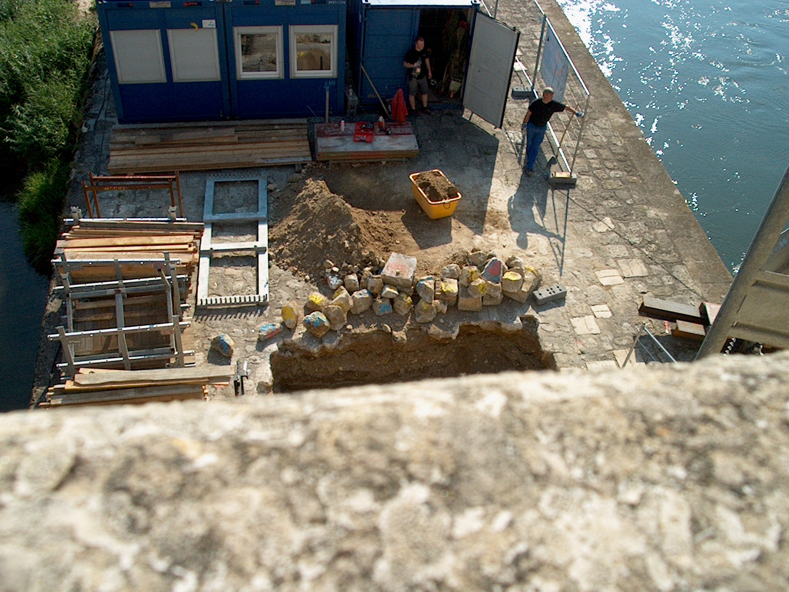 Bridge work from above. They numbered the rocks while jack-hammering them out, so they can put them back in the right spots? (31/59)
