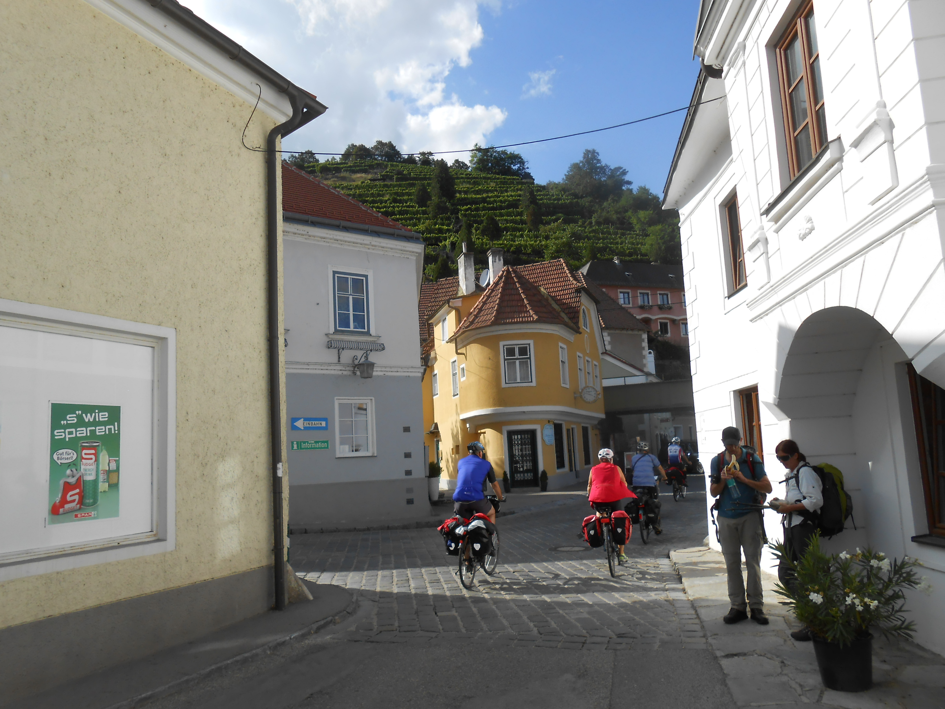 We left the bike path to follow a road through another gorgeous old town (cobblestone road of course) with vineyards on the slopes above. (56/125)
