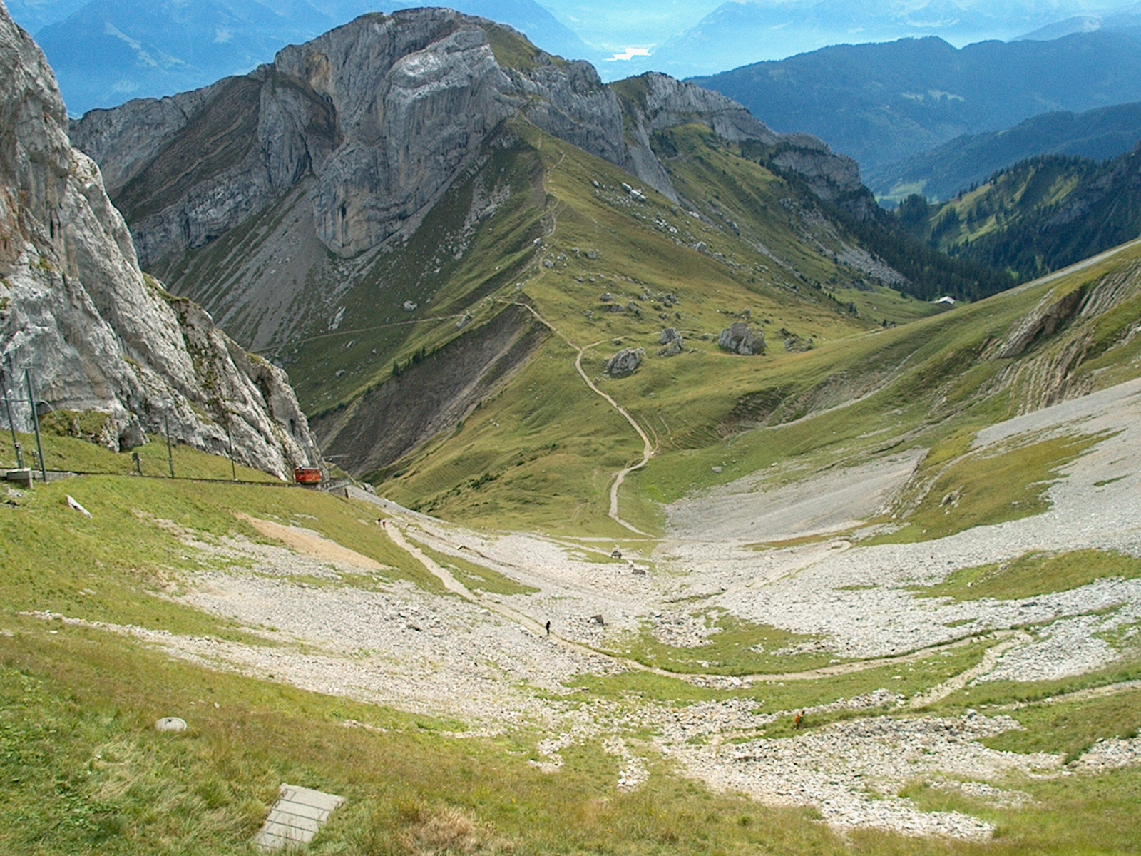 Overlook has incredible views here of the cog rail and hiking trail, with people on the hiking trail! (31/84)