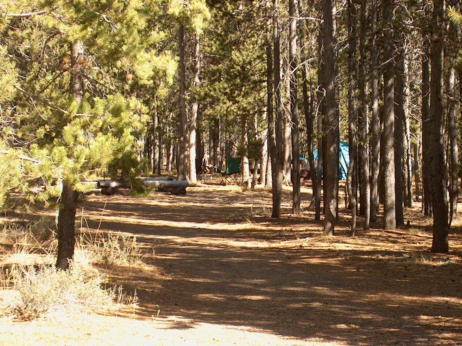 Looking back at our campsite - fire pit with log seats, tent and picnic table on the right. (7/158)