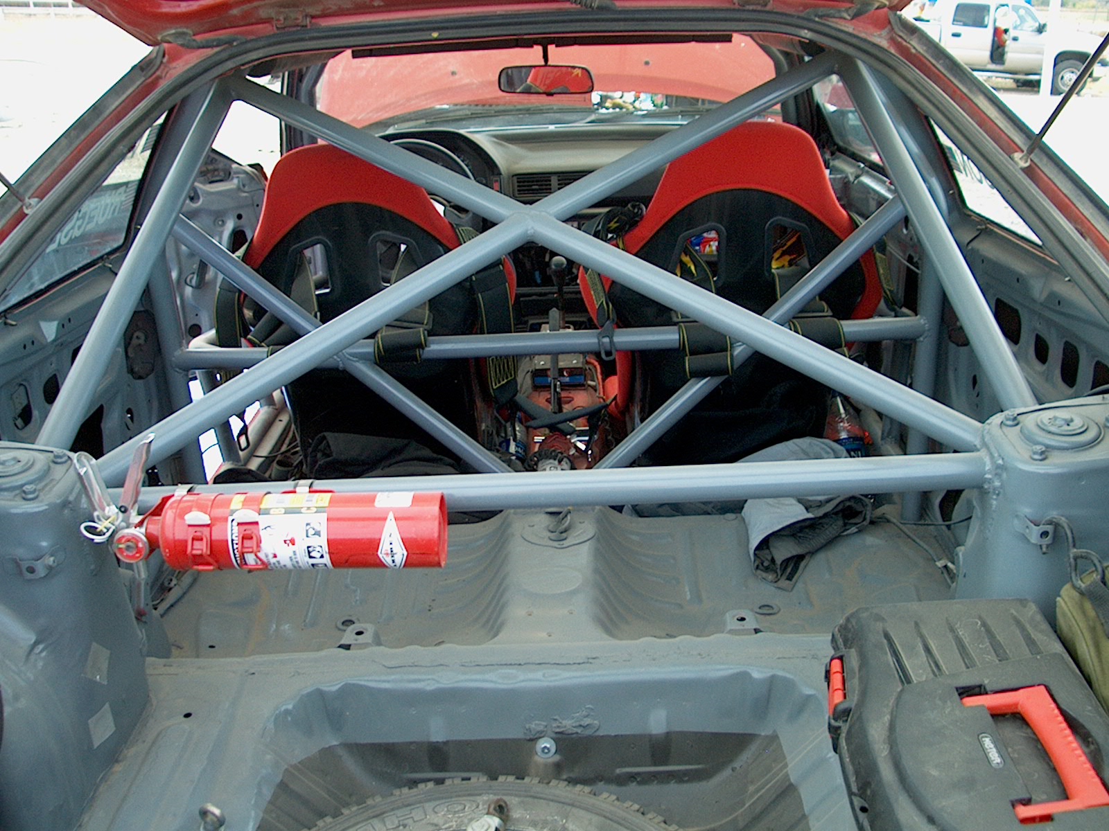 Inside of a rallye car - frame, roll cage, and not much else (48/92)